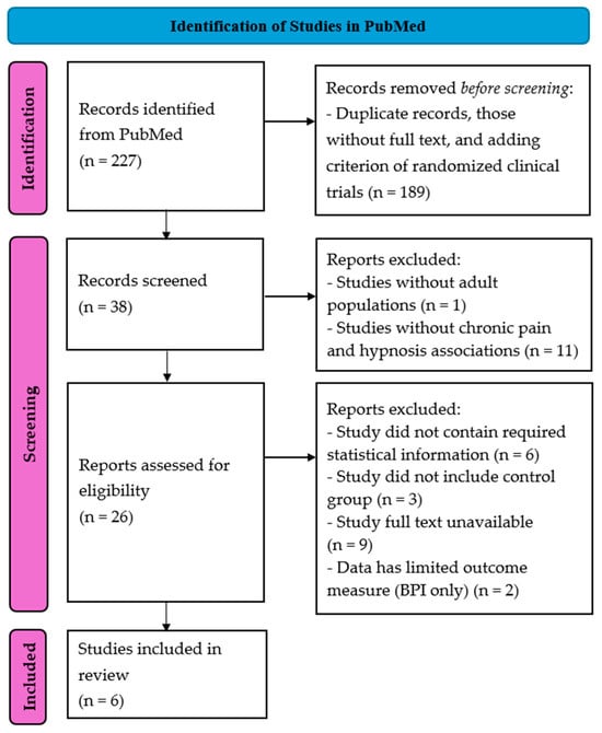 Based on the literature search, 227 study results emerged. After removing duplicate records and publications without full text and adding the criterion for RCTs, 38 studies remained. After selecting the results in accordance with the inclusion criteria and exclusion criteria, six manuscripts remained. The study selection flowchart is shown in Figure 7.