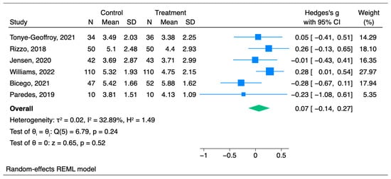 For the remaining four papers that used live hypnosis sessions, the Hedges g’s score was 0.56 [95%CI 0.05–1.07] (p = 0.03), which shows a statistically significant reduction in the pain score in the hypnosis group (Figure 5) [21,22,24,25].