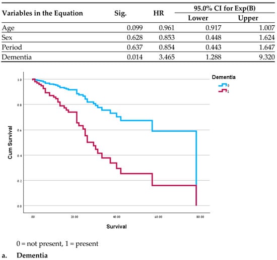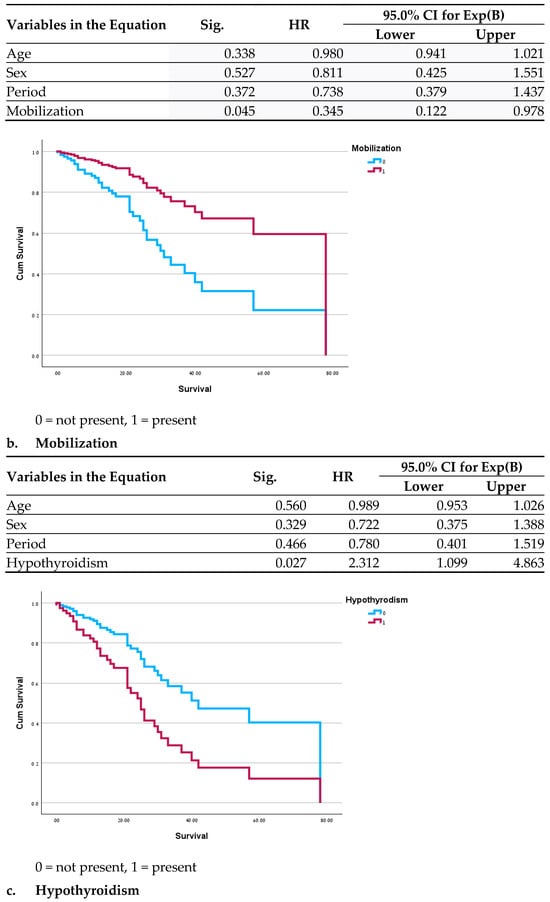 Significant differences in clinical outcomes included a lower mortality rate (p = 0.035 before the pandemic and 0.008 during the pandemic) and a shorter duration of diarrhea during both periods in the GH population (p < 0.01 for both periods). In a survival analysis for the MC patients, no significant differences were found between the two periods before and after adjustment for age, gender and period. Variables demonstrating a significant correlation with mortality were hypothyroidism (HR = 2.3; p = 0.027), dementia (OR = 3.4; p = 0.014), and reduced mobility (HR = 0.34; p = 0.045) (Figure 1); recurrent pneumonia almost reached statistical significance (HR = 2; p = 0.07). In the assessment of all the variables in a single model, no significance was found, likely due to the small sample size. Survival analysis was not performed for the GH patients due to the low mortality rate.