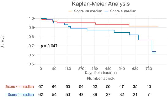 The primary endpoint, a composite of all-cause mortality and HF-related hospitalizations, occurred in 16 patients (13 HF hospitalizations/3 deaths) after 6.3 (IQR: 2.8–17.1) months. The full observation period was 20.3 (IQR: 10.2–23.0) months. In Kaplan–Meier analysis, a COMPASS-31 score above the median of 14 was also associated with the primary endpoint of all-cause mortality and HF-related hospitalization (Figure 3, log-rank p = 0.047). In Cox regression analysis, the COMPASS-31 score failed to demonstrate significant association with the primary endpoint (p = 0.11).