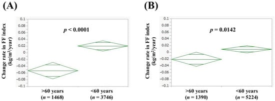 In men aged 60 years or more (n = 1468) and less than 60 years (n = 3746), the average (±SD) change rate in FF index was −0.053 ± 0.45 kg/m2/year and 0.020 ± 0.49 kg/m2/year (p < 0.0001, Figure 1A). In women aged 60 years or more (n = 1390) and less than 60 years (n = 5224), the average (±SD) change rate in FF index was −0.021 ± 0.39 kg/m2/year and 0.0090 ± 0.40 kg/m2/year (p = 0.0142, Figure 1B).