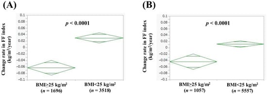 In men with BMI > 25 kg/m2 (n = 1696) and BMI < 25 kg/m2 (n = 3518), the average (±SD) change rate in FF index was −0.063 ± 0.57 kg/m2/year and 0.030 ± 0.43 kg/m2/year (p < 0.0001, Figure 2A). In women with BMI > 25 kg/m2 (n = 1057) and BMI < 25 kg/m2 (n = 5557), the average (±SD) change rate in FF index was −0.044 ± 0.45 kg/m2/year and 0.012 ± 0.39 kg/m2/year (p < 0.0001, Figure 2B).