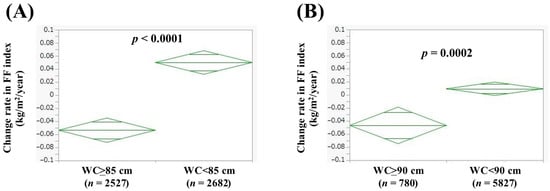 In men with WC >85 cm (n = 2527) and WC < 85 cm (n = 2682), the average (±SD) change rate in FF index was −0.054 ± 0.53 kg/m2/year and 0.050 ± 0.43 kg/m2/year (p < 0.0001, Figure 3A). In women with WC > 90 cm (n = 780) and WC < 90 cm (n = 5827), the average (±SD) change rate in FF index was −0.047 ± 0.45 kg/m2/year and 0.0094 ± 0.39 kg/m2/year (p = 0.0002, Figure 3B).