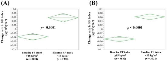 In men with baseline FF index > 18 kg/m2 (n = 3224) and baseline FF index < 18 kg/m2 (n = 1990), the average (±SD) change rate in FF index was −0.036 ± 0.50 kg/m2/year and 0.058 ± 0.44 kg/m2/year (p < 0.0001, Figure 4A). In women with baseline FF index > 15 kg/m2 (n = 3582) and baseline FF index < 15 kg/m2 (n = 3032), the average (±SD) change rate in FF index was −0.047 ± 0.45 kg/m2/year and 0.062 ± 0.31 kg/m2/year (p < 0.0001, Figure 4B).