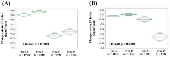 In men, the average (±SD) change rate in FF index according to alcohol intake was 0.026 ± 0.45 kg/m2/year in Type A (n = 1968), 0.066 ± 0.45 kg/m2/year in Type B (n = 2310), −0.24 ± 0.31 kg/m2/year in Type C (n = 493), and −0.19 ± 0.72 kg/m2/year in Type D (n = 443) (p values: A vs. B, p = 0.0611; A vs. C, p < 0.0001; A vs. D, p < 0.0001; B vs. C, p < 0.0001; B vs. D, p < 0.0001; C vs. D, p = 0.0115; overall p < 0.0001, Figure 5A). In women, the average (±SD) change rate in FF index according to alcohol intake was 0.0056 ± 0.41 kg/m2/year in Type A (n = 4125), 0.025 ± 0.38 kg/m2/year in Type B (n = 1936), −0.035 ± 0.39 kg/m2/year in Type C (n = 401), and −0.26 ± 0.30 kg/m2/year in Type D (n = 152) (p values: A vs. B, p = 0.0744; A vs. C, p = 0.0495; A vs. D, p < 0.0001; B vs. C, p = 0.0056; B vs. D, p < 0.0001; C vs. D, p < 0.0001; overall p < 0.0001, Figure 5B).