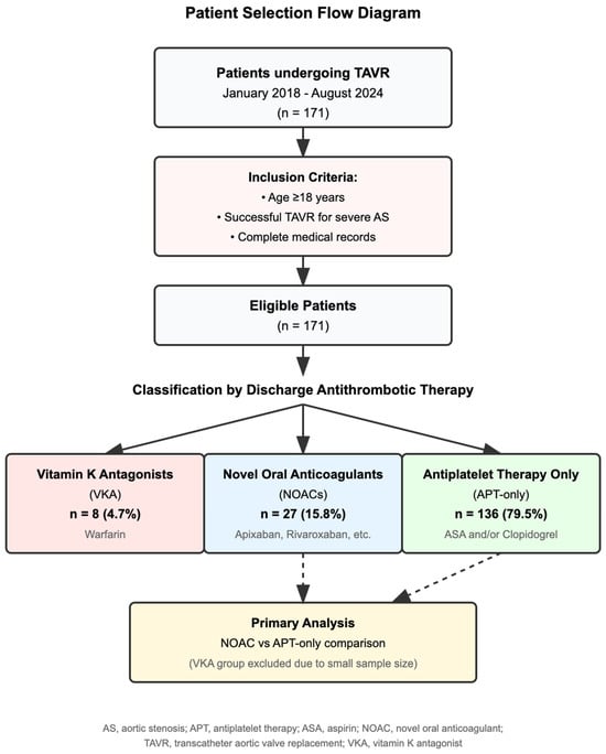 Patients were classified according to the discharge antithrombotic regimen into three groups: (1) novel oral anticoagulants (NOACs)—apixaban, rivaroxaban, edoxaban, or dabigatran; (2) Vitamin K antagonists (VKAs)—warfarin with a target INR of 2.0–3.0; and (3) antiplatelet therapy only (APT-only)—aspirin (75–100 mg), clopidogrel (75 mg), or dual antiplatelet therapy (DAPT) without oral anticoagulation (Table 1 and Table 2). Both anticoagulated groups received concomitant antiplatelet therapy. The APT-only group received standard care for patients without anticoagulation indications. Detailed antithrombotic regimens and indications for anticoagulation were extracted from medical records and categorized as atrial fibrillation, venous thromboembolism, valve thrombosis concern, or other indications.