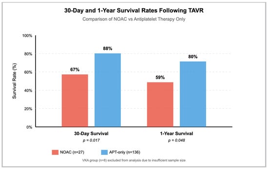 Post-TAVR survival: NOAC versus antiplatelet therapy Survival rates at 30 days and 1 year post-TAVR for NOAC (n = 27, red) and APT-only (n = 136, blue) groups. Patients receiving NOAC showed significantly lower survival rates at both timepoints (p = 0.017 and p = 0.048, respectively). The VKA group (n = 8) was excluded due to insufficient sample size.