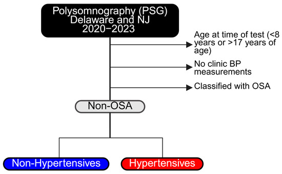 This is an IRB-approved retrospective chart review, completed July 2023–April 2024 from pediatric patients at Nemours Children’s Hospital who underwent polysomnography (PSG) in either the Wilmington, DE or Deptford, NJ locations between January 2020 and May 2023. This study was deemed exempt from informed consent by the Nemours Children’s Hospital Institutional Review Board and did not require participant consent. Eligibility criteria included children ages 8–17 years, regardless of gender, who had completed PSG and had office visit blood pressure recordings (Figure 1). Electronic medical records were reviewed for demographics and clinical data. Charts from 285 patients aged at least 8 years old and no older than 17 at the time of PSG were analyzed. Inter-rater reliability was ensured by frequent meetings that included developing clear operational definitions for information gathering. In the event of ambiguity, a meeting was conferred prior to continuing to allow for discussion and clarification. Charts were separated into OSA and non-OSA groups. Those without OSA were selected for future evaluation. OSA classification was based on PSG results according to the 2012 AASM scoring manual. Pediatric scoring rules for apnea and hypopnea and the categorization for OSA severity can be found here [14].