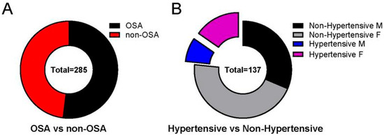 Of the 285 charts reviewed, 137 did not meet criteria for OSA on PSG (Figure 2) and were classified as non-OSA. Of the 137 non-OSA patients, 83 were females (60.6%) and 54 were males (39.4%). There was no statistically significant difference for sex. Of the 137 non-OSA patients, 32 were hypertensive (23.4%). All 32 had systolic hypertension; 2 patients had both systolic and diastolic hypertension.