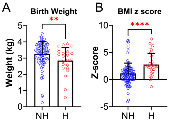 Anthropometric data between non-hypertensives (NH) and hypertensives (H). (A) Birth weight was significantly lower in hypertensives [H, (N = 32, red)] compared to non-hypertensives [NH,(N = 105, blue) (NH: 3.25 ± 0.78 kg vs. H: 2.85 ± 0.83 kg, p = 0.0097)]. (B) BMI z-score was significantly higher in hypertensives (H, N = 32, red) group compared to non-hypertensives (NH, N = 105, blue) group (NH: 1.10 ± 1.94 vs. H: 2.76 ± 2.08, p < 0.0001). Data is reported as mean ± standard deviation. Two-tailed t-test; ** p < 0.001, **** p < 0.0001.