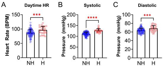We also examined anthropometric data and found some statistically significant differences between the NH group and H group. Birth weight was lower in the NH group compared to the H group (NH: 3.25 ± 0.78 kg vs. H: 2.85 ± 0.83 kg, p = 0.0097, Figure 3A). There was also a difference between NH and H for BMI (Figure 3B), where BMI z-score was higher in the H group (NH: 1.10 ± 1.94 vs. H: 2.76 ± 2.08, p < 0.0001). Daytime HR (NH: 86.39 ± 12.3 vs. H: 126.2 ± 8.6 BPM, p = 0.0004, Figure 4A), systolic BP (NH: 63.4 ± 8.7 vs. H: 126.2 ± 8.6 mmHg, p < 0.0001, Figure 4B), and diastolic BP (NH: 63.4 ± 5.6 vs. H: 68.1 ± 6.7 mmHg, p = 0.0006, Figure 4C), were significantly higher in the H group compared to the NH group (Figure 4).
