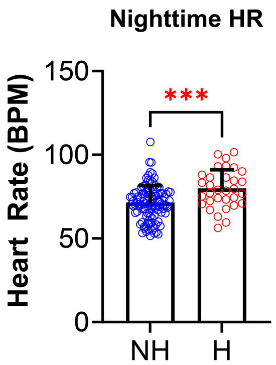 PSG parameters were analyzed for differences between the NH and H groups (Table 4). Of all the PSG parameters, only the nighttime heart rate differed and was higher in the H group than the NH group (NH: 71.2 ± 10.4 vs. H: 79.6 ±11.5 BPM; p = 0.0003, Figure 5). There were no statistically significant differences between total sleep time (TST), sleep efficiency (SE), obstructive apnea index (OAI), hypopnea index (HI), apnea index (AI), apnea hypopneas index (AHI), O2 saturation nadir, %O2 below 90%, nocturnal hypoxemia, baseline EtCO2, %TST EtCO2 >50, hypoventilation, TST snoring, percent time in N1, N2, N3, or R, REM AHI, arousal index, WASO, or PLM index between the two groups.