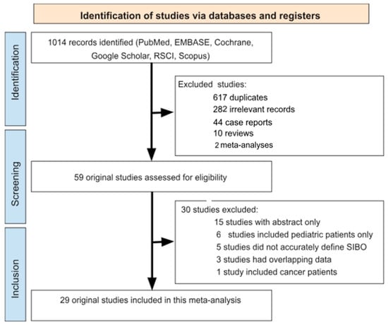 The remaining 59 studies underwent meticulous full-text evaluation based on our inclusion criteria. This thorough assessment resulted in the exclusion of 30 additional articles that did not meet our methodological requirements, including 15 studies with abstracts only, 6 studies that included pediatric patients, 5 that did not accurately define SIBO cases, 3 studies that recruited a study population overlapping with that of another study and 1 study included cancer patients. The systematic review process and the number of papers identified in each stage are shown in Figure 1.