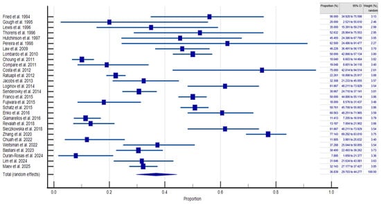 Forest plot showing the generalized prevalence of SIBO in PPI-treated patients [,,,,,,,,,,,,,,,,,,,,,,,,,,,,].