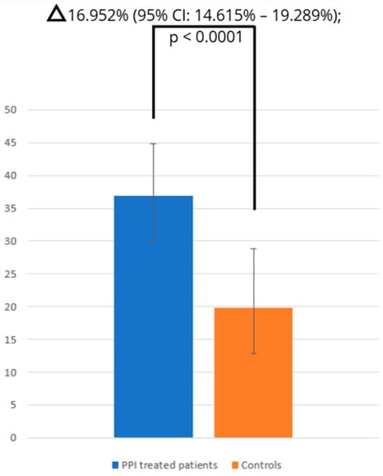 The clinical implications are significant, given that SIBO is associated with various conditions, including irritable bowel syndrome, inflammatory bowel disease, chronic pancreatitis, liver cirrhosis, and metabolic disorders like diabetes and non-alcoholic fatty liver disease [,,,,]. The widespread prescription of PPIs for acid-related disorders—such as gastroesophageal reflux disease (GERD) and peptic ulcers—further amplifies the relevance of our findings []. PPIs are often recommended as the first-line treatment for these conditions, with therapy durations ranging from 4 to 8 weeks [,]. However, in cases of chronic or recurrent GERD, maintenance therapy may extend up to six months or longer [], and for Barrett’s esophagus, lifelong PPI therapy is commonly advised []. All of these patients have a high risk of SIBO as a consequence of intestinal symptoms, which was shown in recent works [,].