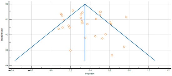 The pooled prevalence of SIBO in PPI-treated patients and controls was 36.839% (95% CI: 29.703–44.277; Figure 2) and 19.887% (95% CI: 12.027–29.399; Figure 3), respectively, and heterogeneity was observed in both cases ( = 94.93%; = 96.66%; p < 0.0001). We assessed publication bias using funnel plot visualization and statistical tests. The funnel plot shows symmetrical study distribution, suggesting no significant bias (Figure 4). Both the Begg–Mazumdar test (p > 0.05) and Egger’s test (p > 0.05) confirmed this finding, demonstrating no evidence of substantial publication bias in our analysis. When analyzing studies that implied the gold-standard method (aspirate culture method), this tendency was also observed (35.877% (95% CI: 19.503–54.158) in PPI-treated patients and 10.783% (95% CI: 6.311–16.273) in controls).
