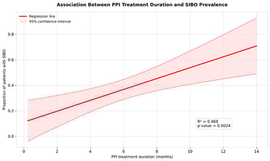 Background/Objectives: Small intestinal bacterial overgrowth (SIBO) is frequently observed in patients treated with proton pump inhibitors (PPIs), yet the role of treatment duration in modulating SIBO risk remains unclear. This meta-analysis aims to evaluate the temporal association between PPI use duration and SIBO risk. Methods: Following the PRISMA 2020 guidelines, a systematic search was conducted across MEDLINE/PubMed, EMBASE, the Cochrane Library, the Russian Science Citation Index, and Google Scholar from 1985 to June 2025 and was previously registered in PROSPERO under the registration number CRD420251031719. Eligible studies included observational designs or clinical trials assessing SIBO in adult PPI users. Results: Twenty-nine studies (n = 3682 PPI patients; n = 2907 controls) were included. The pooled SIBO prevalence among PPI-treated patients was 36.839% (95% CI: 29.703–44.277), significantly higher than that among controls (19.887%; 95% CI: 12.027–29.399). PPI use was associated with increased SIBO risk (OR = 2.143; 95% CI: 1.446–3.175), with high heterogeneity (I2 = 77.61%). A duration-dependent trend was observed: our meta-regression analysis demonstrated a significant positive association between PPI treatment duration and SIBO prevalence with the regression coefficient 4.265% (95% CI: 1.827–6.384; p = 0.0024), indicating that each additional month of PPI therapy was associated with a 4.265 percentage increase in SIBO risk. Conclusions: PPI use significantly increases the risk of SIBO, with longer treatment durations associated with higher odds.