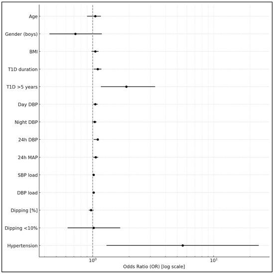 There were no significant differences in HbA1c and T1D duration between patients with abnormal nocturnal dipping < 10% and normal dipping ≥10% (7.6 ± 1.6% vs. 7.6 ± 1.5%, p = 0.9, and 7.1 ± 3.6 years vs. 6.9 ± 3.5 years, p= 0.7, respectively) (Table 1). Patients with poor glycemic control and HbA1c > 6.5% had a worse diastolic BP profile, as shown in Table 3, compared to those with HbA1c of ≤6.5%. They were also more often diagnosed with AH [34 (12.4%) vs. 2 (2.5%), p = 0.009]. In univariate logistic regression, longer T1D duration (OR = 1.086; 95% CI: 1.007–1.172; p = 0.033) and higher 24 h diastolic BP (OR = 1.065; 95% CI: 1.018–1.115; p = 0.0068) were significantly associated with HbA1c > 6.5% (Table 4) (Figure 1). The presence of AH was also linked to impaired glycemic control (OR = 5.55; 95% CI: 1.30–23.62; p = 0.020). In the multivariate logistic regression analysis, both the 24 h diastolic BP and T1D duration remained independently associated with HbA1c > 6.5%.