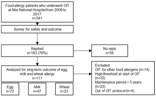 - Manabe, T.; Sato, S.; Yanagida, N.; Hayashi, N.; Nishino, M.; Takahashi, K.; Nagakura, K.I.; Asaumi, T.; Ogura, K.; Ebisawa, M. Long-term outcomes after sustained unresponsiveness in patients who underwent oral immunotherapy for egg, cow’s milk, or wheat allergy. Allergol. Int. 2019, 68, 527–528. [Google Scholar] [CrossRef] [PubMed]