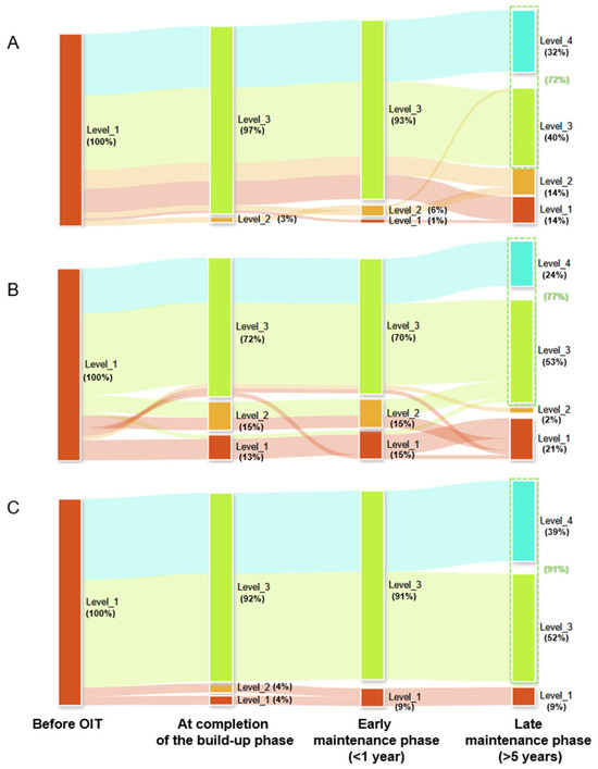 Longitudinal desensitization outcomes for each allergen group. Sankey diagrams illustrate the temporal progression of desensitization levels from the start of OIT through the build-up, early maintenance (<1 year), and late maintenance (>5 years) phases. (A) Egg OIT, (B) Milk OIT, (C) Wheat OIT. Each stream represents the proportion of patients at each desensitization level (described in Methods). Abbreviation: OIT, oral immunotherapy.
