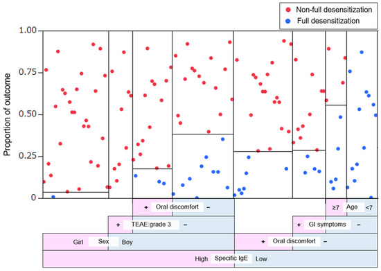 A multivariate logistic regression analysis was performed to identify factors independently associated with full desensitization. Variables with a p-value < 0.1 in univariate analyses, as well as clinically relevant factors identified a priori (e.g., age, gender, comorbid allergic diseases), were included in the model. A decision tree analysis, using the same variables as the logistic model, was also performed to illustrate key predictors of desensitization. All statistical analyses were performed using JMP version 17 (SAS Institute Inc., Cary, NC, USA).