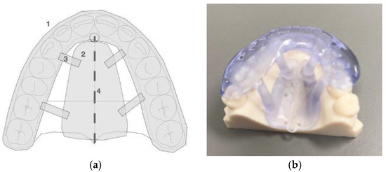 (a) Schematic image of the midpalatal piezoguide: 1—occlusal splint, 2—baseplate, 3—connector, and 4—piezocortical incision notches. (b) Piezoguide fitted on the model.