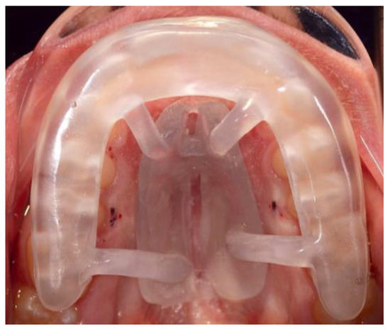 Midpalatal piezocorticotomy guide positioned in the mouth against the maxillary arch with the connectors attached to the baseplate firmly accommodated against the palatal vault. Piezocorticotomy notches are located based on the 3D planning of the location of the nasal septum.