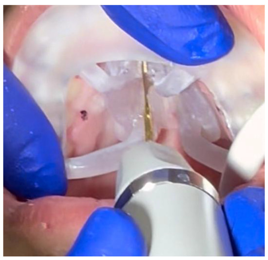 A 33-year-old male presented with an anterior open bite and bilateral posterior crossbite. He underwent MARPE expansion with guide-assisted midpalatal piezocorticotomy, performed under local anesthesia with topical and infiltrative applications. Antibiotic premedication was administered 1 h before the procedure (Figure 11).