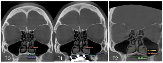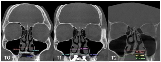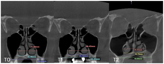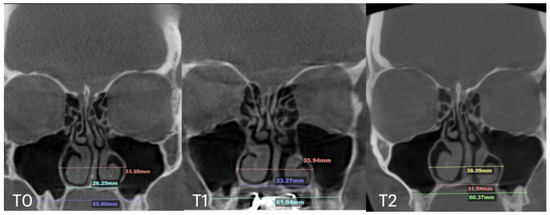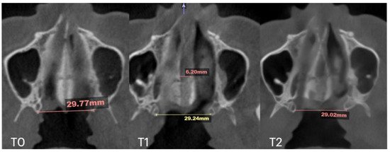 Before (T0) and after (T1) MARPE midfacial expansion with guide-assisted midpalatal piezocorticotomy, and 11 months after the completion of expansion (T2). The expansion of 5.7 mm was achieved over the 9 weeks of expansion with 1 turn/day. Stability of the nasal base width is evident at T1 and T2. Ossification of the suture is confirmed in coronal projection of the septum view.