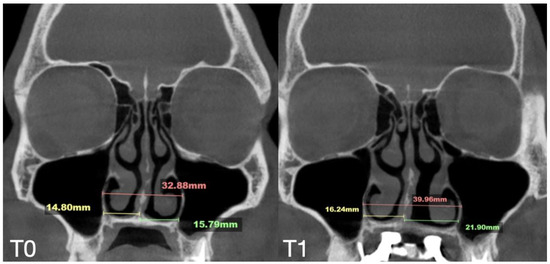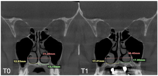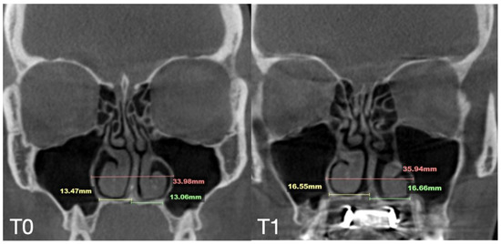 Pre- (T0) and post-MARPE (T1) expansion measurements with the blind midpalatal piezocorticotomy. (T0) Nasal base measurements before MARPE expansion after blind midpalatal piezocorticotomy: lateral nasal width equals 32.88 mm and the right and left septum-lateral wall widths equal 14.80 and 15.79 mm, correspondingly. (T1) Post-MARPE expansion measurements: lateral nasal width equals 39.96 mm and the right and left septum-lateral wall widths resulted in 16.24 and 21.90 mm, respectively.