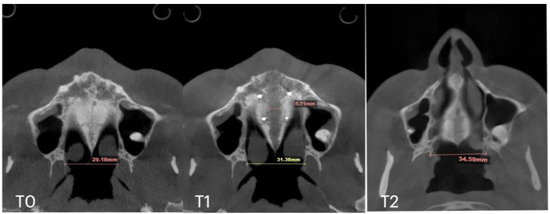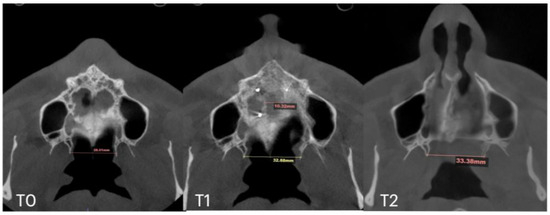 Pre- (T0), post-expansion (T1), and at the 12 months follow up (T2) evaluation of the midpalatal suture in axial projection. Inter-pterygoid distance was measured at all time points, pointing at a significant increase from 28.01 to 32.88 mm, which remained stable in the 12 months after expansion.