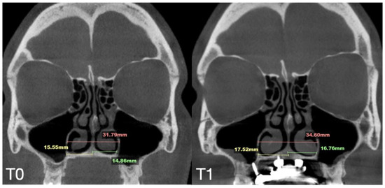 Pre- (T0) and post-MARPE (T1) expansion measurements with the blind midpalatal piezocorticotomy. (T0) Nasal base measurements before MARPE expansion after guided midpalatal piezocorticotomy: lateral nasal width equals 31.79 mm and the right and left septum-lateral wall widths equal 15.55 and 14.86 mm, correspondingly. (T1) Post-MARPE expansion measurements: lateral nasal width equals 34.60 mm and right and left septum-lateral wall widths resulted in 17.52 and 16.76 mm, respectively.