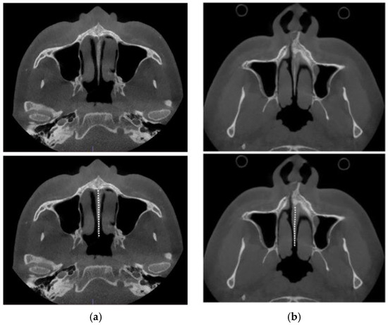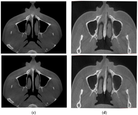 As shown in Figure 16, nasal septum variability extends beyond the coronal plane and poses additional challenges when evaluated in the axial plane. This complexity contributed to the asymmetric nasal septum displacement observed in Case A.
