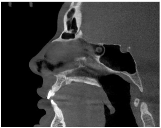 A 25-year-old male patient underwent MARPE midfacial expansion with midpalatal piezocorticotomy, opting not to use the piezocorticotomy guide. The patient presented with a skeletal Class III base, anterior open bite, and posterior open bite. The procedure was performed under local anesthesia with topical and infiltrative application in the midpalatal area. Landmarks were visually positioned along the mucosal outline of the midpalatal suture, followed by piezotome incisions (Piezosurgery touch, Mectron, Hilliard, OH, USA). Expansion followed a one-turn/day protocol over 12 weeks. The result (Figure 5) revealed unfavorable suture separation with asymmetrical nasal septum displacement and unilateral nasal airway expansion favoring the left side.