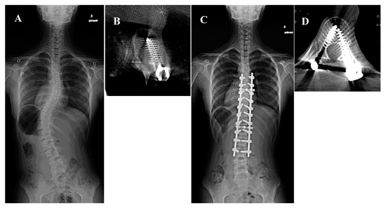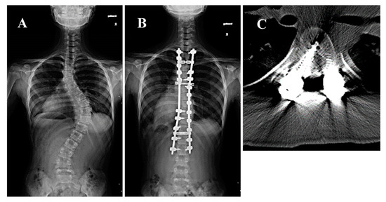Pedicle screws (PSs) comprise the most prevalent segmental fixation system to stabilize all three columns of the spine in adolescent idiopathic scoliosis (AIS) surgery. After Suk et al. provided their initial results of thoracic PS placement [1], PSs have provided stable anchor points connected to rods, which can aid the surgical management of complex spinal deformities in AIS. However, PS perforation has the potential risk of correction loss, neurological deficits, and organ damage [2,3]. Recent morphometric analyses confirm that up to 30–35% of pedicles in AIS patients show anatomical abnormalities, particularly in the proximal thoracic region [4,5]. The visceral structures at risk during PS insertion in a scoliosis patient differ at each vertebral level. There is also a higher risk of injury to the spinal cord at the PT concave side screws at the T2 and T3 levels and the main concave sides at the T5–9 levels [6].
