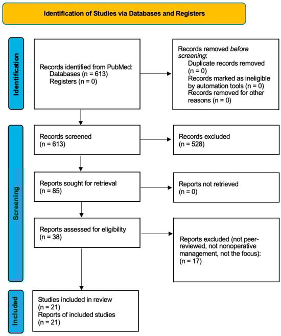 A total of 613 studies were identified through PubMed. After the screening of the title and abstract, 85 articles remained. Following a full-text review, 21 were included in the final analysis (Figure 1). Sixty-four full-text articles were excluded after reviewing due to a lack of relevance to nonoperative treatment, a focus on surgical management, or insufficient outcome data.