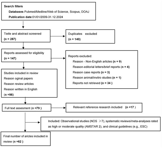 The methodological quality of the included studies was assessed using validated appraisal tools. Observational studies were evaluated using the Newcastle-Ottawa Scale (NOS), with only studies scoring at least 7 out of 9 points being included. Only systematic reviews and meta-analyses rated as high or moderate quality using the AMSTAR 2 tool were considered. Clinical practice guidelines, such as those issued by the European Society of Cardiology, were not subject to methodological scoring but were included due to their recognized authority and relevance in clinical decision-making. Additional relevant publications were identified through citation tracking and reference review of selected articles. The selection process of publications included in the review is illustrated in Figure 1.
