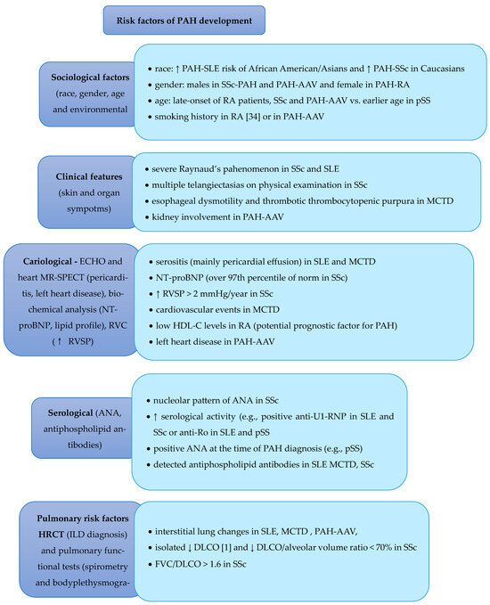 PAH appears more often than clinicians usually suspect. The development of this complication is associated with the need to quickly solve many clinical problems in everyday cardiology or rheumatology practice. Since the prevalence of pulmonary arterial hypertension in CTD varies between different diseases (PAH is the most prevalent in SSc or SLE), populations (e.g., increased PAH-SSc incidences in European countries, and PAH-SLE in Asian regions), and races (e.g., highly prevalent PAH-SSc in African Americans) we decided to describe the PAH risk factors that are common and independent of ancestry. Unfortunately, the diagnosis of PAH is delayed due to many non-specific symptoms and an insidious onset of pulmonary pathological changes, causing a delay in the treatment. Therefore, knowing the risk factors related to PAH development may help in fast and efficient diagnostics. These risk factors depend on specific features of diseases, e.g., in SSc, the risk is higher if patients present severe Raynaud’s phenomenon, severe fingertip ulcers [1], and many telangiectasias on physical examination [2]. The risk factor increasing PAH prevalence in pSS is the presence of anti-SSA/Ro antibodies in serum [3]. Some data emphasize the correlation of PAH with high SLE activity related to pericardial effusion, mild ILD, and increased serological activity [4,5,6,7,8,9,10,11,12].