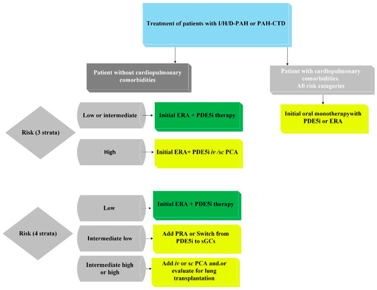 Proposed treatment regimen for PAH associated with connective tissue disease (PAH-CTD), based on ESC 2022 guidelines for the diagnosis and treatment of pulmonary hypertension and developed by the authors to summarize and illustrate key therapeutic steps.; ERA—endothelin receptor antagonist; I/H/D-PAH—idiopathic, heritable, or drug-associated pulmonary arterial hypertension; iv—intravenous; PAH-CTD—PAH associated with connective tissue disease; PCA—prostacyclin analog; PDE5i—phosphodiesterase 5 inhibitor; PRA—prostacyclin receptor agonist; sc—subcutaneous; sGCs—soluble guanylate cyclase stimulator.