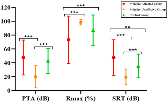 When analyzing the results in terms of PTA, Rmax, and SRT, we found that the poorest auditory performance—both in pure-tone thresholds and speech recognition—was observed in the Ménière affected group, followed by the control group and finally the Ménière unaffected group. A comparative analysis using the Mann–Whitney U test revealed several statistically significant differences between groups, as summarized in Table 3 and illustrated in Figure 1.