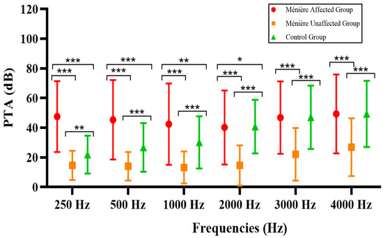 Pure-tone thresholds were analyzed by frequency (250 Hz to 4000 Hz), comparing mean values across the three groups using one-way ANOVA or Kruskal–Wallis tests, depending on normality. Post-hoc pairwise comparisons were performed using Bonferroni-adjusted t-tests or Mann–Whitney U tests as appropriate.