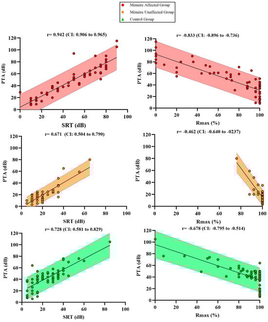 As shown in Figure 3, scatterplots were used to illustrate the relationship between PTA, SRT, and Rmax across the three study groups. Each plot displays the Spearman’s correlation coefficient (r) with its 95% confidence interval, and the shaded area represents the 95% confidence band of the linear regression.