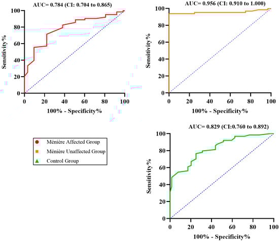 The Ménière unaffected group exhibited the highest discriminative performance, with an AUC of 0.956 (95% CI: 0.910–1.000), indicating an excellent ability of PTA to predict elevated SRT. The control group followed with an AUC of 0.829 (95% CI: 0.760–0.898), consistent with good predictive capacity. In contrast, the Ménière affected group showed a lower AUC of 0.784 (95% CI: 0.704–0.865), revealing a marked decline in the ability of PTA to correctly identify patients with impaired speech recognition in this subgroup.