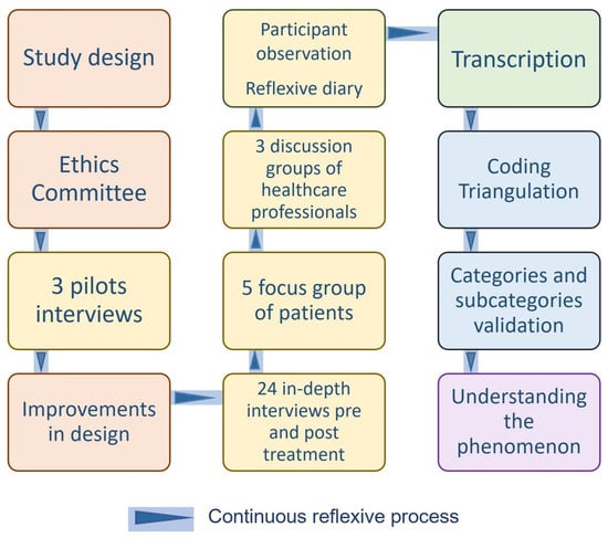 Thirty hours of recordings were included from 24 in-depth interviews of 12 subjects with CNP (one before treatment started and the second one a month later), four focus groups with CNP patients (23 subjects), and three focus groups with healthcare professionals (46 subjects). Notes from the participant observation and reflective diary were also considered. Theoretical saturation was reached. The research process flowchart can be consulted in Figure 1.