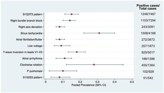 Eleven distinct ECG abnormalities were identified, and their pooled prevalence rates were estimated. Figure 2 summarizes each abnormality’s prevalence and 95% CIs. The prevalence of the S1Q3T3 pattern was reported in all included studies [7,9,13,14,15,16,17,18,19,20,21,22,23,24,25,26,27,28,29,30,31,32,33,34], followed by RBBB (21 studies) [7,9,13,14,16,17,18,20,21,22,23,24,25,26,28,29,30,31,32,33,34], right axis deviation (13 studies) [9,13,14,17,20,21,24,25,26,27,30,31,33], and sinus tachycardia (13 studies) [7,13,14,16,17,18,19,21,27,29,31,33,34].