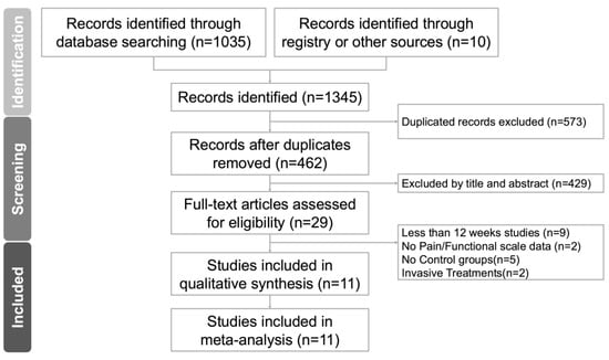 A PRISMA flowchart detailing the literature search is presented in Figure 1, and the PRISMA network meta-analysis extension checklist is provided in Table S1. From an initial pool of 29 articles, 11 RCTs (n = 548) met the inclusion criteria (Table 1) [3,11,12,13,14,15,16,35,36,37,38]. As summarized in Supplementary Table S3, the most frequent reasons for excluding 18 full-text articles [2,6,9,10,17,18,20,39,40,41,42,43,44,45,46,47,48,49] included a follow-up duration shorter than 12 weeks (n = 8), absence of a control group (n = 6), use of invasive interventions such as injections or surgery (n = 2), and missing key outcome data (n = 2). These criteria were applied consistently to ensure methodological comparability.