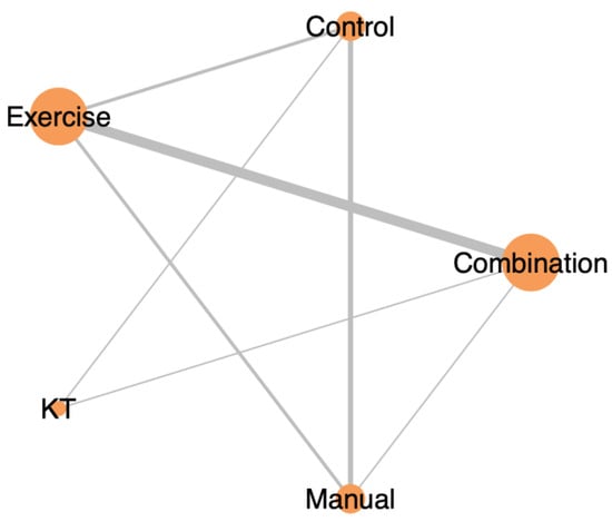Among the included participants, 152 received exercise therapy alone, 66 received manual therapy alone, 78 received KT, 140 received combination therapy (e.g., exercise plus manual therapy, KT, or extracorporeal shock wave therapy (ESWT)), and 112 were assigned to control groups. These allocations are illustrated in the network plot (Figure 2), where node sizes reflect total sample size and edge thickness denotes the number of studies per direct comparison.
