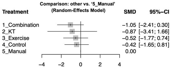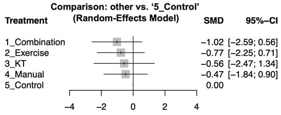 After a 12-week intervention, combination therapy also showed significant pain reduction (effect size: −1.05; 95% CI: −2.41 to 0.3). KT (effect size: −0.87; 95% CI: −3.41 to 1.66) and exercise therapy (effect size: −0.52; 95% CI: −1.77 to 0.74) demonstrated marginal effects while manual therapy did not demonstrate a statistically significant improvement compared to the control groups. Detailed pairwise comparisons are illustrated in Supplementary Figure S3 and summarized in Figure 4. Treatments were ranked based on their effect sizes for pain reduction, with combination therapy being the most effective, followed by exercise therapy, KT, and manual therapy. Please see Table 3 for the complete comparison and ranking.