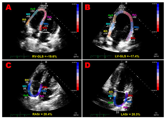 Illustrations of right ventricular global longitudinal strain (A), left ventricular global longitudinal strain (B), right atrial reservoir strain (C), and left atrial reservoir strain (D) measurements obtained from the apical four-chamber view in a pHDP patient from this study. All myocardial strain values are decreased relative to the established reference ranges. GLS, global longitudinal strain; LASr, left atrial reservoir strain; LV, left ventricular; pHDP, previous hypertensive disorder of pregnancy; RASr, right atrial reservoir strain; RV, right ventricular.