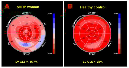 Figure 2 displays representative LV-GLS bull’s-eye plots from a pHDP woman with a third-trimester BMI exceeding 27 kg/m2 and a pregnancy complicated by PE (Panel A) and from a woman with a history of an uncomplicated pregnancy (Panel B).